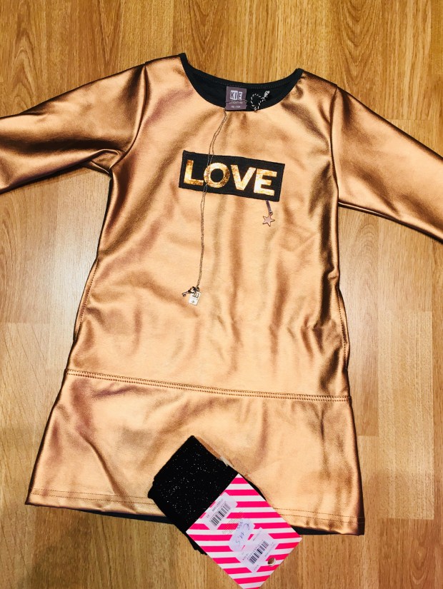 Kie stone kleed metallic copper 98-104 en 110-116, normale prijs €49,95, nu aan €30