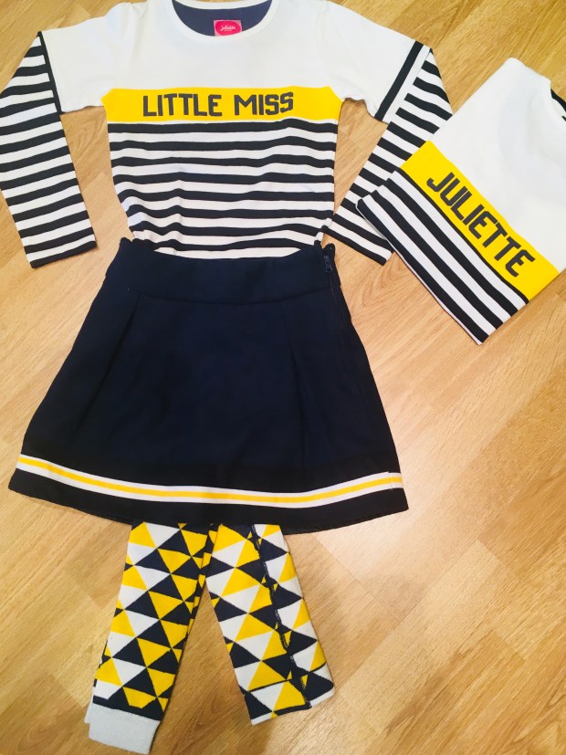 T-shirt 122 en 152, normale prijs €32,95, nu aan €20 / rokjes maat 116,122,128 en 152, normale prijs €44,95, nu aan €27 / legging 116 tem 152, normale prijs €22,95, nu aan €14