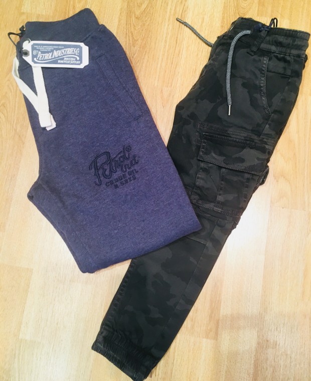 Jogpants Petrol Industries 10j en 14j, normale prijs €39,95, nu €24 camouflage pants 4j, 12j, normale prijs €€49,95, nu €30