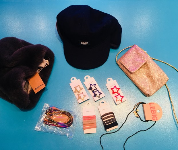 Bonte muts kleine meisjes beige en grijs €15 ipv €25 / jongens Scotch & Soda pet €25 ipv €45. / armbandjes Bellerose €7 ipv €15. / Lebig ketting +armband veertjes €5 ipv €20. / glitter mobile bag Name It €8 ipv €8,99. / sterrenspeldjes Name It €1,99 en elastiekjes €3,99