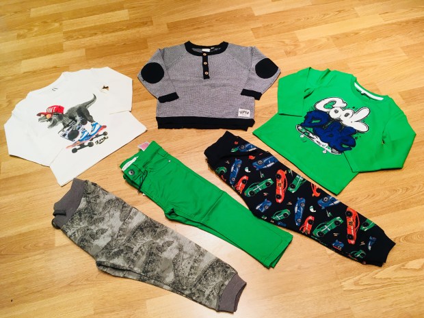 Tshirt dino 92-128 €11,99 / sweater blauw-wit 80-110 €21,99 / tshirt lm groen 80-110 €14,99 / auto jogpants 92-128 €21,99 / groene broek 92-122 €19,99 / krokodillen jogpants 80-110 €19,99