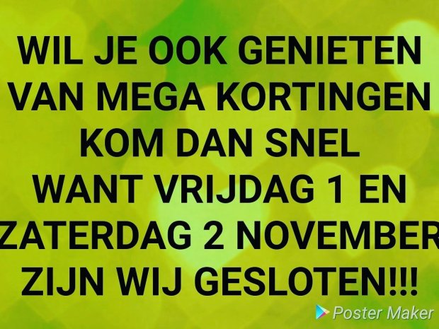 Scary sale😱😱🧟♀️🤑🤑 oktober 26, 2019 Kom in de herfstvakantie (tem 31/10/19) profiteren van 20% (extra) korting bij aankoop vanaf 2 stuks!! Dit delen: Delen op X (Opent in een nieuw venster) X Share op Facebook (Opent in een nieuw venster) Facebook Vind-ik-leuk Aan het laden... Gerelateerd