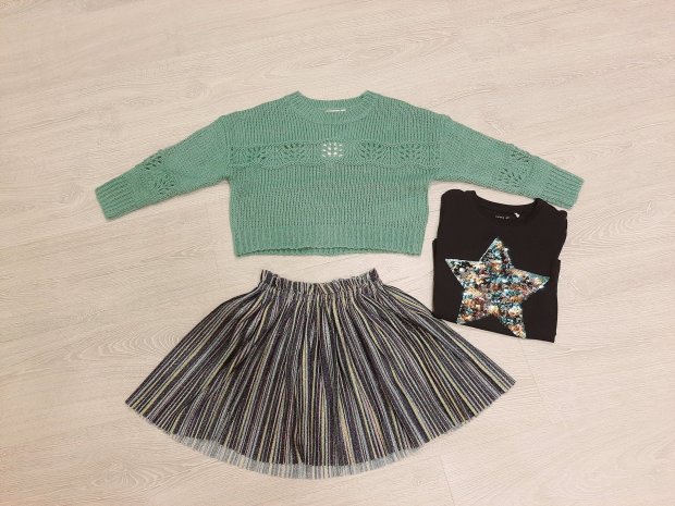 Korte pullover vanaf 116 tem 158-164, komt op €29,99. T-shirt lange mouw vanaf 116 tem 146-152, komt op €12,99. Rok vanaf 116 tem 164, komt op €22,99